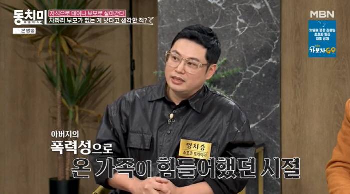 양치승은 "이런 생각을 하면 안 되는데, 아버지가 폭력성이 심해 차라리 내가 고아였으면 좋겠다는 생각을 한 적이 있다"라고 털어놨다. 이어 "너무 힘들어서 그랬다. 집이 감옥처럼 느껴졌다. 매일 맞아서 고아가 낫지 않을까 이런 생각이 든 거였다. 아버지는 희생을 하지 않았다. 퇴직금을 받으면 보통 가족을 위해 쓰지 않나. 근데 그러지 않고 주식에 투자했다가 1년도 안 돼 다 날렸다. 행복감이 없었다"라고 덧붙였다.