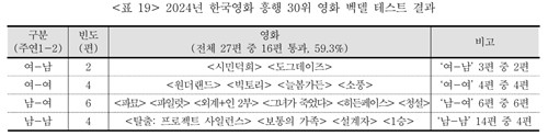 벡델 테스트는 영화의 성평등 정도를 평가하는 시험으로 '이름을 가진 여성 인물이 최소 2명 등장하는가', '그 두 명이 서로 대화를 나누는가', '그 대화의 주제가 남자 이외의 것인가'라는 질문을 모두 통과해야 한다. 영진위는 흥행 상위 30편 중 성별 분석의 모호함이 있는 애니메이션 '사랑의 하츄핑', 다큐멘터리 '건국전쟁', 공연 실황 영화 '임영웅│아임 히어로 더 스타디움'을 제외한 27편을 분석했다.