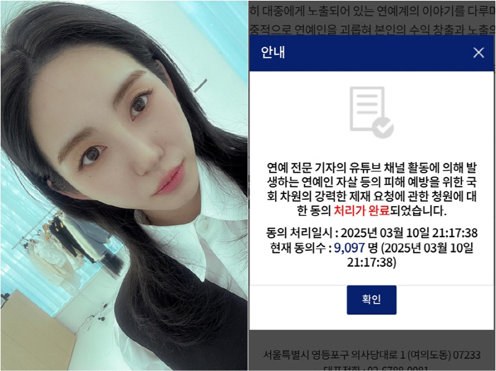 공개된 사진은 국회전자청원 홈페이지의 국민동의 청원 페이지다. 권민아가 '연예 전문 기자의 유튜브 채널 활동에 의해 발생하는 연예인 자살 등의 피해 예방을 위한 국회 차원의 강력한 제재 요청'이라는 청원에 참여한 것. 지난 달 24일부터 시작된 이 청원은 11일 기준 약 1만 4000여명이 동의한 상태다.