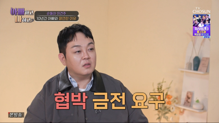 이건주는 순돌이로 활동하던 어린 시절부터 최근까지 아빠로부터 금전 요구와 협박을 받아왔고, 이로 인해 10년째 절연한 상태라는 사실을 고백했다. "건주가 돈 잘 버는데 너희만 잘 먹고 잘 살면 안되지 않냐"라는 아빠의 요구에 대해 이건주는 "저는 그렇게 잘 먹고 잘 산 적이 없다"라며 분노했다. 그러면서 "내가 아버지의 존재를 부정하면 끝날 줄 알았다. 도대체 부자지간이 뭐길래 나를 이렇게까지 속상하게 하실까"라며 한을 토해냈다.