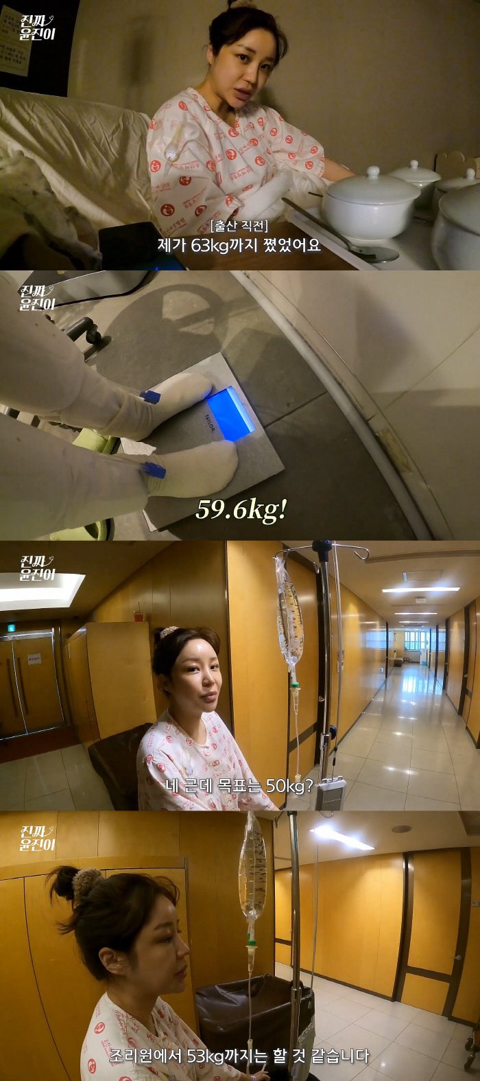 윤진이는 또 "(출산 직전) 63kg까지 쪘다. 출산 후 몸무게는 59.6kg다. 딱 아기 몸무게만큼 빠졌다"라며 "좌절이야. 아직 60kg이네. 여기서는 다이어트할 생각은 없고 회복하는 데 중점을 둬야 하니까 살은 빼지 않는 걸로 하겠다. 조리원에서 53kg까지 만들어보겠다"고 다짐했다.