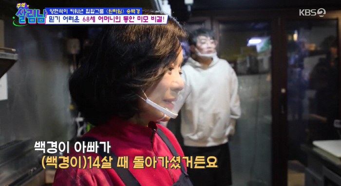이후 송백경 어머니는 아들과 같이 일하게 된 계기를 언급하며 과거를 회상했다. 어머니는 "아들이 14세 때 남편이 세상을 떠났다"라며 줄곧 식당일을 하며 홀로 두 남매를 키워낸 시절을 털어놓고, 송백경은 "어머니가 30년 넘게 식당일을 하시고 마지막으로 아들 매장에서 제일 고생하고 있다"라며 고마운 마음을 드러냈다.