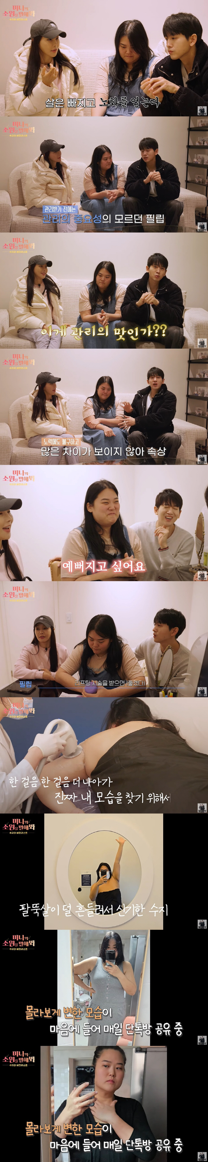 상담 후 원장 선생님은 체형 치료에서 핵심적으로 필요한 탄력 치료를 제안했다. 이후 본격 탄력 치료를 받고, 팔뚝살부터 늘어난 턱살, 얼굴살이 사라진 수지 씨의 모습이 눈길을 끌었다.