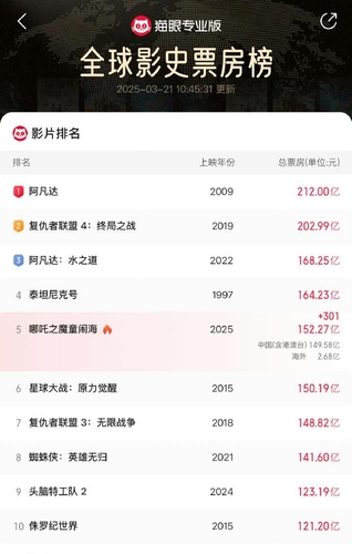 너자2는 현지시간 기준 지난 15일 오전 흥행 수익 150억2천100만위안(약 3조366억원)을 기록하며 '스타워즈; 깨어난 포스'를 제치고 글로벌 박스오피스 5위에 진입했다.
