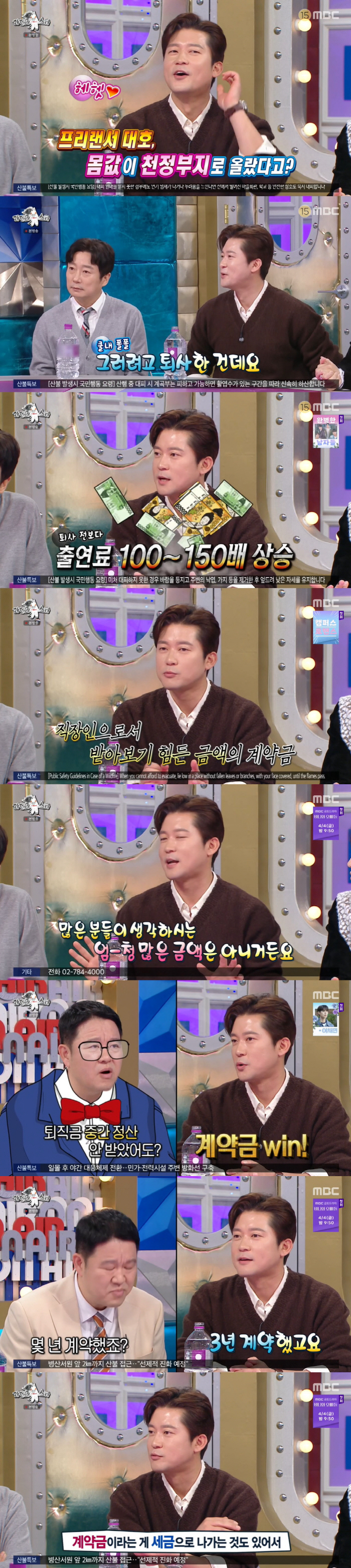 김대호는 "과연 이 돈이 내 평생에 볼 수 있는 단위인지 놀랐지만, 그렇다고 많은 분들이 생각하시는 엄청 많은 금액은 아닌 것 같다"고 해명했다. 그러면서 그는 "중간에 퇴직금을 정산해서 계약금이 더 크다. 퇴직금 중간 정산을 안 했다 쳐도 계약금이 더 크다"고 솔직하게 밝혔다. 이때 이수근은 "나도 받아보지 못한 계약금을 받았더라"고 했다.