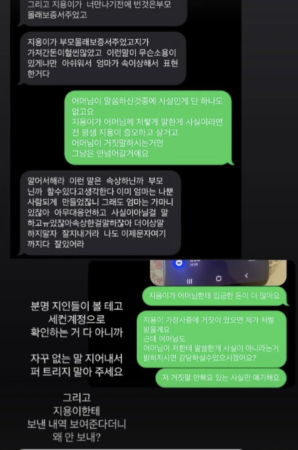 이다은 씨는 2일 자신의 계정에 A씨와 나눈 메시지 내용을 공개했다. 이에 따르면 A씨는 "지용이가 너 만나기 전에 번 것은 부모 몰래 보증 서줬고 자기가 가져간 돈이 훨씬 많았다. 이런 말이 무슨 소용이 있겠냐만 아쉬워서 속이 상해서 표현한 거다"라고 말했다.