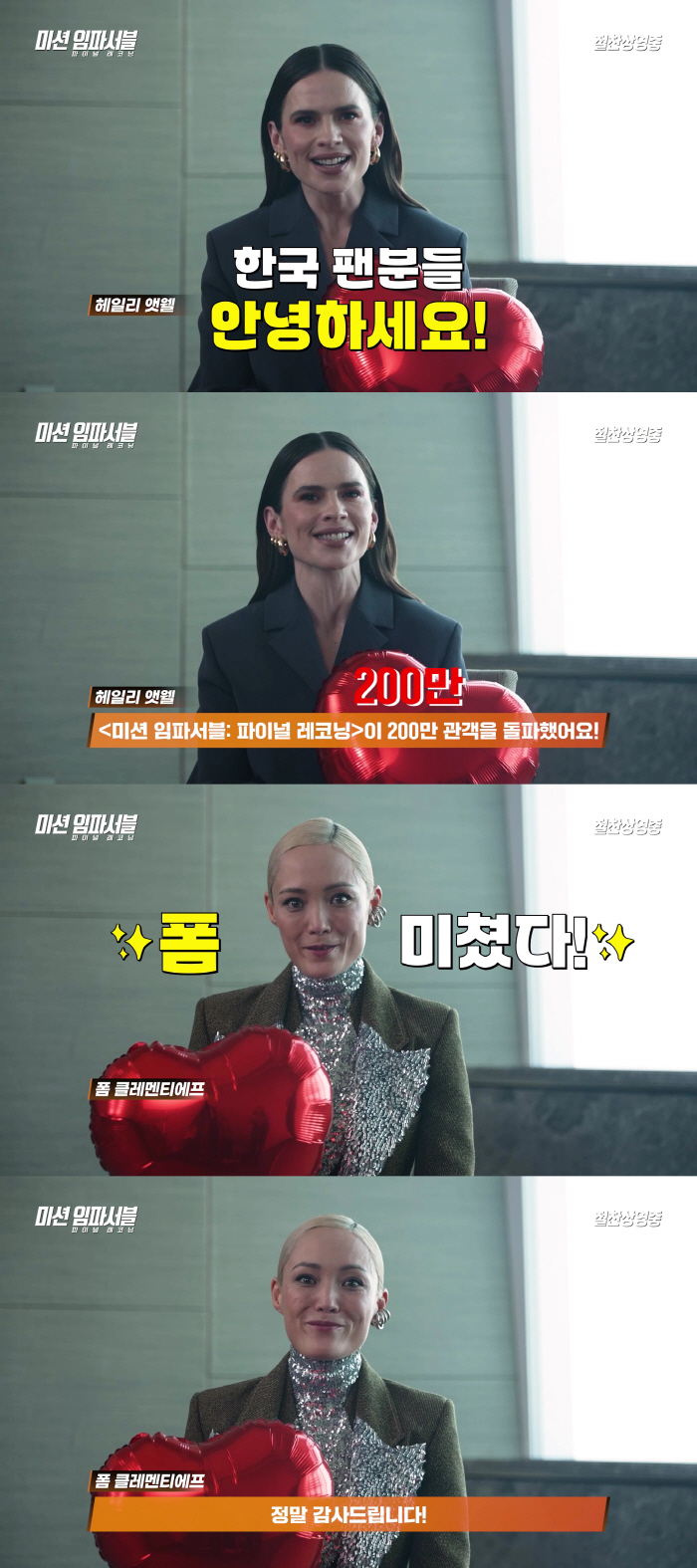 극 중 새로운 활약을 선보인 두 인물 그레이스 역의 헤일리 앳웰과 파리 역의 폼 클레멘티에프가 200만 관객 돌파 소식에 대한 감사 인사를 전했다. 헤일리 앳웰은 "한국 팬분들 안녕하세요"라고 밝은 미소로 인사를 전한 뒤, "'미션 임파서블8'이 200만 관객을 돌파했다"며 관객들의 뜨거운 관람 열기에 기쁜 마음을 드러냈다. 이어 폼 클레멘티에프는 "폼 미쳤다"라며 자신의 이름을 활용한 한국 유행어로 재치 있는 인사를 전해 팬들의 반가움을 자아낸다.