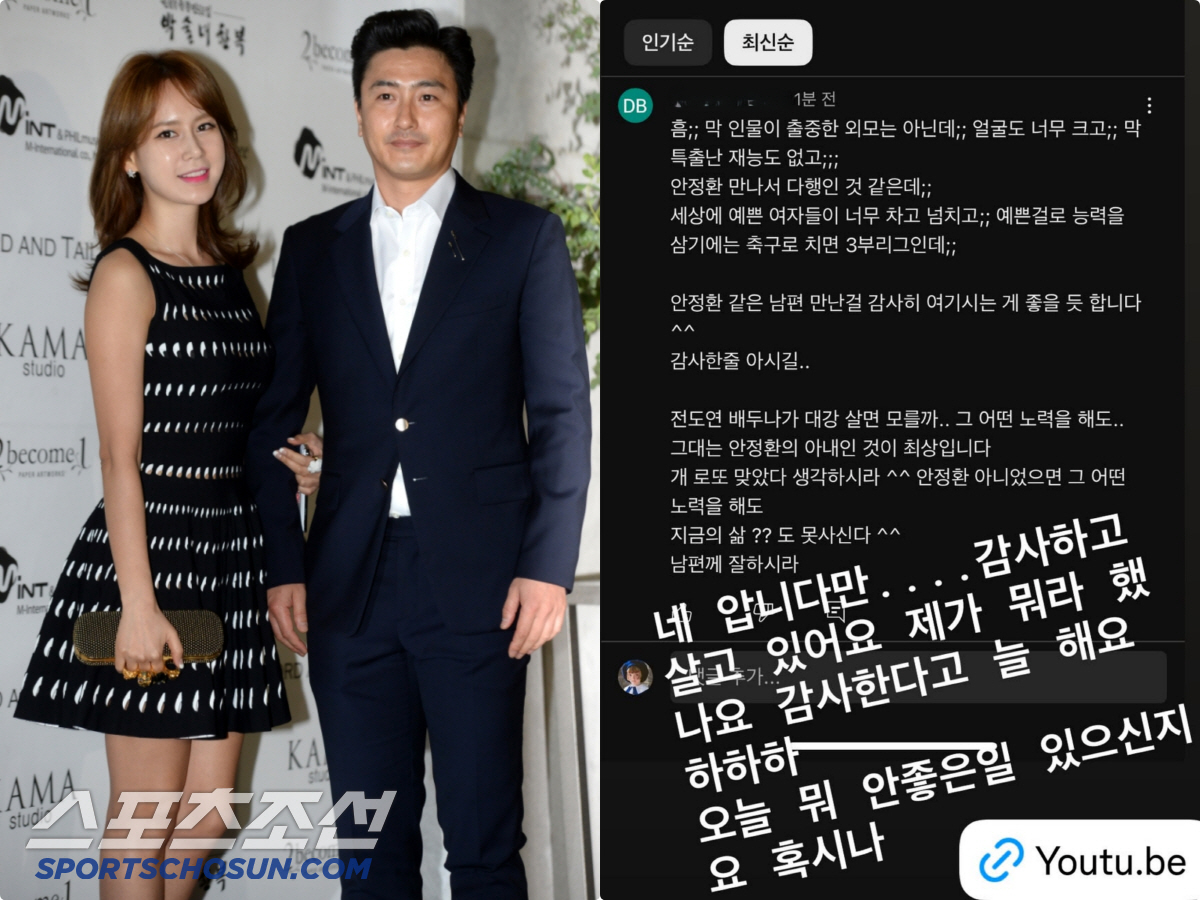 이어 "안정환 같은 남편 만난 걸 감사히 여기시는 게 좋을 듯 하다. 감사한 줄 알라"며 "그대는 안정환의 아내인 것이 최상이다. 로또 맞았다고 생각하라. 안정환 아니었으면 그 어떤 노력을 해도 지금의 삶도 못사신다. 남편께 잘하라"라고 무례한 발언도 덧붙였다.