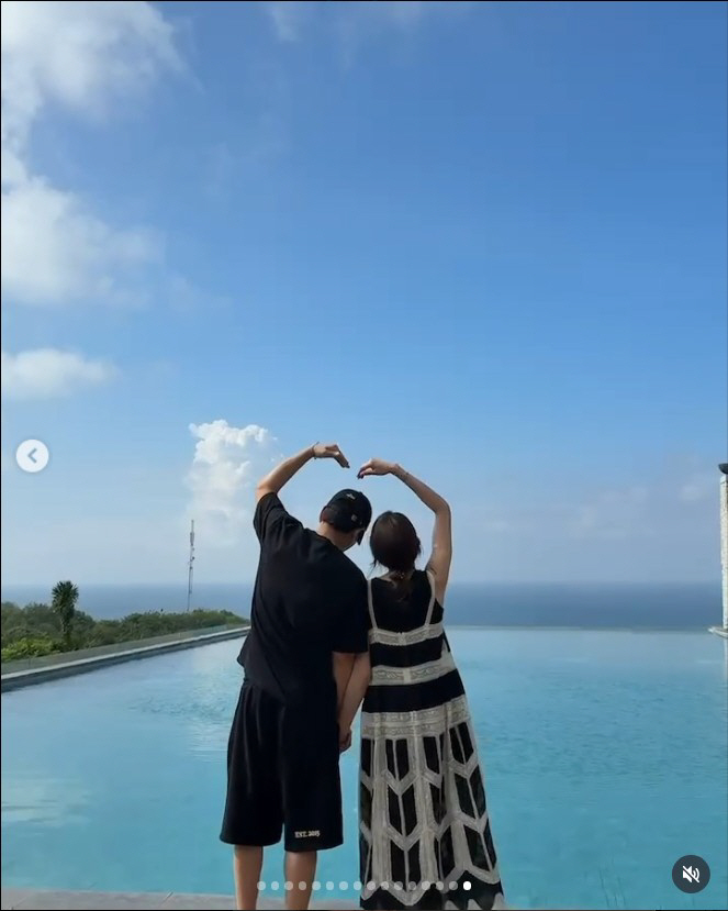 사진 속 두 사람은 푸른 바다와 인피니티 풀을 배경으로 손을 맞잡고 포즈를 취하거나, 다정하게 서로 기대 셀카를 찍으며 달콤한 시간을 만끽하는 모습이다.