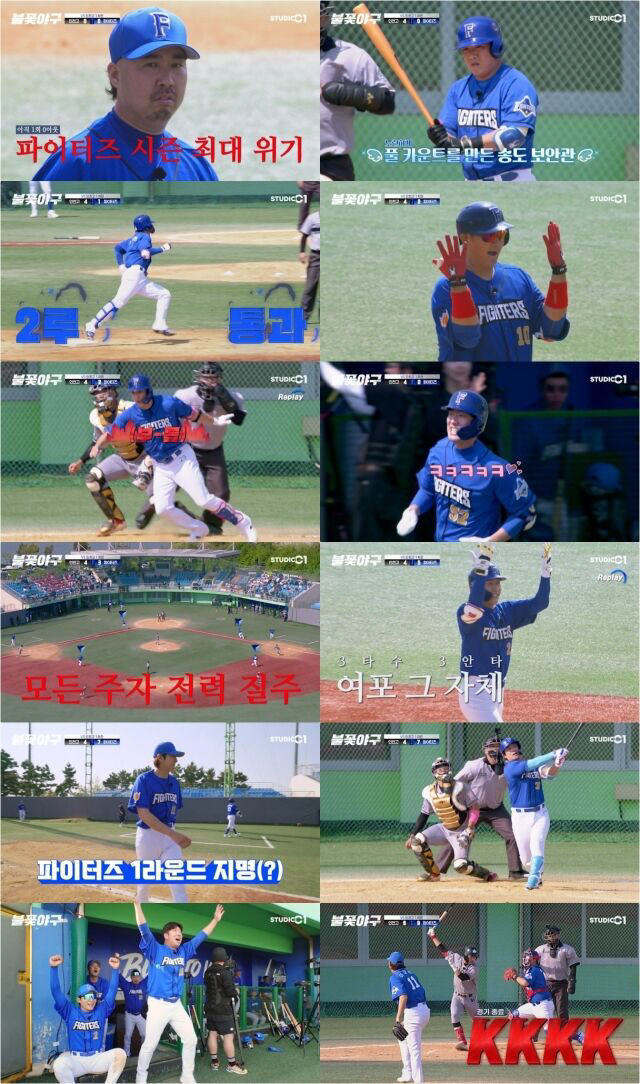 23일 공개된 스튜디오C1 유튜브 예능 '불꽃야구' 8화에서는 불꽃 파이터즈가 인천고와의 대결에서 1회 대량 실점 위기를 딛고 9:6 승리를 거뒀다. 선발 유희관이 1회에만 4실점하며 흔들렸지만 마운드와 타선이 빠르게 회복하며 끝내 역전승을 완성했다.