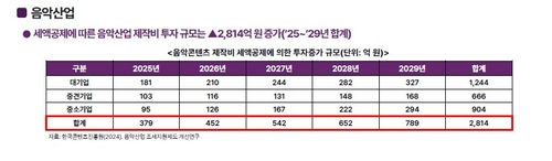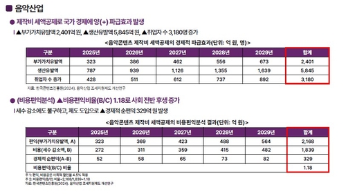 송 센터장은 2024년 한국콘텐츠진흥원 연구를 인용해 음악산업에 세액공제 혜택이 적용되면 기업들의 제작비 투자 규모는 2025∼2029년 합계 2천814억원이 증가하고, 취업자는 3천180명 증가한다는 계산을 내놓았다.