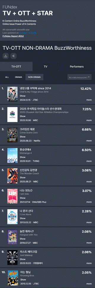 굿데이터코퍼레이션이 발표한 10월 2주차 순위는 2025년 10월 6일부터 2025년 10월 12일까지 방송 또는 공개 중이거나 예정인 TV 비드라마와 OTT 오리지널 비드라마 그리고 각 프로그램에 출연한 출연자와 게스트를 조사 대상에 포함하였다.