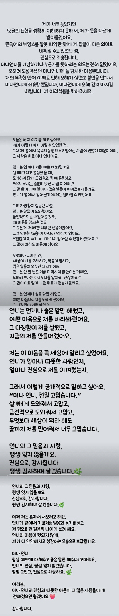 또 "세상이 나를 오해하고 악플이 달리고 많은 말들이 오갔던 그 시기에도 언니는 단 한번도 저를 미워하지 않았다. 오히려 '나는 수지 누나를 알아요. 괜찮아요' 그 한마디로 얼마나 큰 위로가 됐는지 모른다. 언니가 얼마나 따뜻한 살마인지 얼마나 진심으로 저를 아껴줬는지 이 마음을 세상에 꼭 알리고 싶었다"고 말했다.
