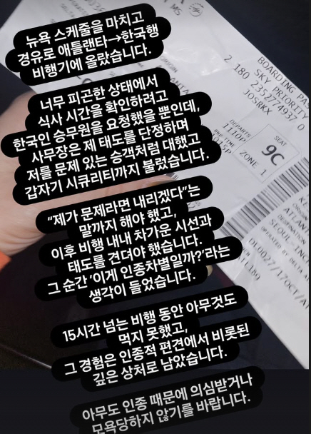 하지만 화장실로 이동하던 중 승무원의 요청에 따랐음에도 사무장이 고압적인 태도로 '나가라'고 지시하고, 한국어 메뉴판을 요청한 동행에게 외국어 메뉴판을 주는 등 부적절한 서비스가 이어졌다고.