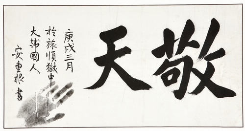 하느님을 공경하라는 뜻으로, 안중근 의사가 뤼순 감옥에서 사형을 집행당하기 전에 썼다. 네 번째 손가락 한 마디가 잘린 손도장이 찍혀 있다.