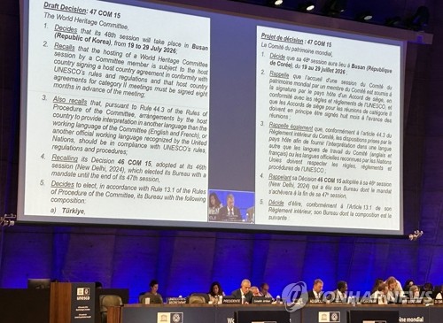 (파리=연합뉴스) 김예나 기자 = 15일(현지시간) 프랑스 파리 유네스코 본부에서 제47차 세계유산위원회가 열리고 있다. 이날 세계유산위는 차기 개최국으로 대한민국을 확정했다. 제48차 위원회는 내년 7월 19∼29일 부산에서 열릴 예정이다. 2025.7.16 yes@yna.co.kr