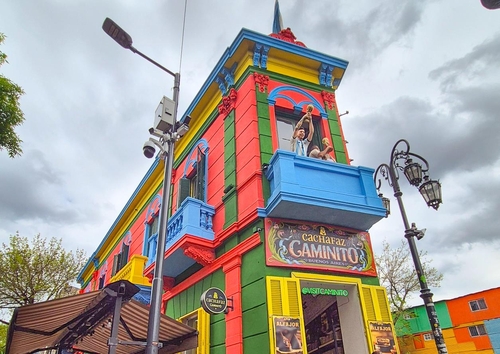 형형색색의 건물과 탱고 선율이 어우러진 명소가 있다. 이곳의 대표 건물 '카차파스 카페'로 관광객들이 2층 발코니로 올라가 사진을 찍는다. 2층 테라스에는 리오넬 메시가 우승컵을 든 모형이 있기 때문이다. 실제 메시가 이곳에서 우승컵을 든 적은 없다고 한다. 그러나 우승컵을 든 메시와 사진을 찍고 싶은 사람들의 바람 때문일까. 차례를 기다리는 줄은 좀처럼 줄어들지 않았다.