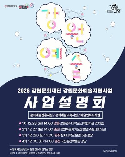 (춘천=연합뉴스) 양지웅 기자 = 강원문화재단은 2026년 강원문화예술지원사업의 주요 내용과 변경 사항을 도민에게 안내하고자 춘천·원주·강릉 등 3개 권역에서 총 4차례에 걸쳐 통합 설명회를 이달 말까지 개최한다고 11일 밝혔다.