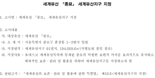 12일 정부 관보에 따르면 국가유산청은 종묘 일대 19만4천89.6㎡(약 5만8천712평) 범위를 세계유산지구로 지정했다.