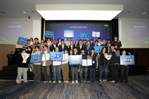 ▲ 방송미디어통신위원회가 주최하고 시청자미디어재단이 주관하는 '2025 청소년 팩트체크 전국대회'와 시청자미디어재단-YTN이 공동 주최하는 '2025 팩트체크 세계대회' 시상식이 지난 12일 서울 마포구 상암동 스탠포드호텔서울에서 열렸다. 국내를 비롯해 남아프리카·러시아·몽골·인도네시아·중국·콩고·필리핀·홍콩 등 전 세계 9개 국가에서 총 182편의 팩트체크 결과물이 접수됐고 전문가 심사를 거쳐 최종 15편이 수상작으로 선정됐다. 세계대회 국내부 대상은 'K-팝 산업의 친환경 앨범 도입이 환경 오염을 완화할까'를 주제로 검증한 경상국립대학교·국립한밭대학교 '케비스콘' 팀이 받았고 세계대회 해외부 대상은 몽골의 우라늄 채굴 관련 정보의 사실 여부를 검증한 몽골 '칠앤체크' 팀이 받았다. 청소년 전국대회 대상은 '비밀번호에 특수문자가 있으면 보안 강도가 올라갈까'를 검증한 옥길새길중학교 'F.A.C.T' 팀에게 돌아갔다. (서울=연합뉴스)