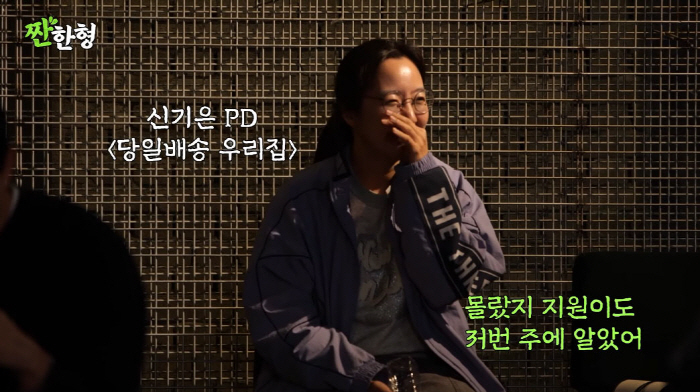 이날 신동엽은 '당일배송 우리집'을 연출한 PD가 가수 민경훈의 아내인 신기은 PD라고 언급해 시선을 모았다. 실제로 이날 '짠한형' 촬영 현장에는 신기은 PD가 함께 자리하고 있어 더욱 관심을 끌었다.
