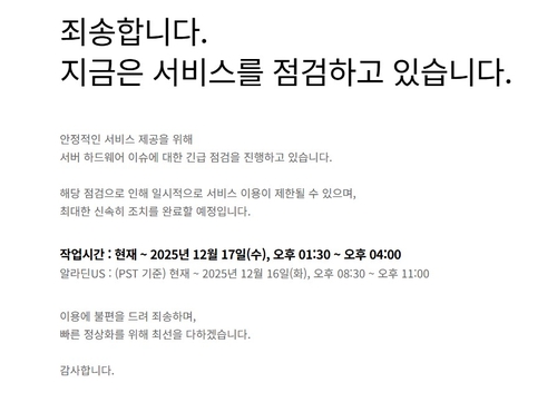 PC는 오후 1시 30분부터 4시까지, 앱은 오후 1시부터 5시까지 서비스를 점검한다고 게시했다.