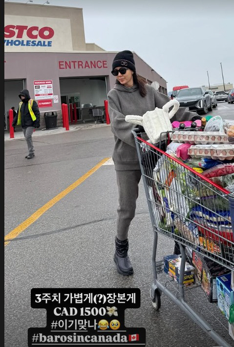 안선영은 사진과 함께 "3주치 가볍게(?) 장보기 CAD 1500"라는 글과 해시태그를 덧붙이며 현실적인 장보기 비용을 공개했다.