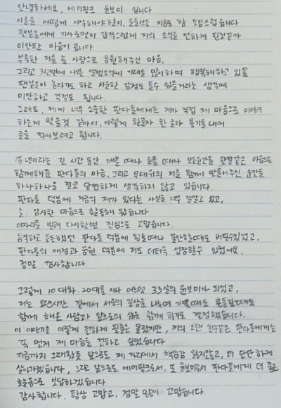 윤보미 역시 팬들에게 가장 먼저 결혼 소식을 전했다. 윤보미는 이날 에이핑크 공식 팬카페에 자필 편지를 올리고 "팬분들에게 기사로 먼저 갑작스럽게 저의 소식을 전하게 된 것 같아 미안한 마음이 크다"며 조심스럽게 말문을 열었다.