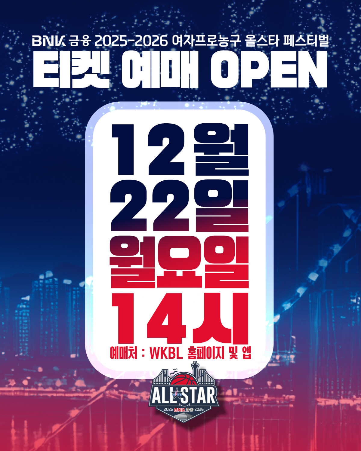 WKBL(한국여자농구연맹)은 오는 22일 오후 2시부터 WKBL 공식 애플리케이션과 홈페이지를 통해 'BNK금융 2025~2026 여자프로농구 올스타 페스티벌' 티켓 예매를 시작한다고 밝혔다.