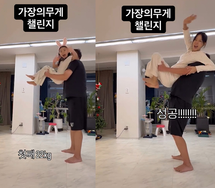 먼저 아빠 문재완은 17kg인 둘째 딸과 22kg인 첫째 딸을 쉽게 안는데 성공, 마지막은 53kg라는 이지혜 순서 였다. 문재완은 잠시 주춤하더니 이지혜를 번쩍 안았고, 이지혜는 환호를 하며 성공의 기쁨을 드러내 웃음을 안겼다.