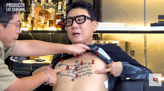 이에 김준호는 "하나 보여줘라. 유뷰트는 이런 거 보여줘야 한다"며 이상만의 타투를 대신 공개했다. 이상민의 가슴팍에는 'Amazing Grace' 가사와 8개의 다양한 크기의 별이 새겨져있었다.