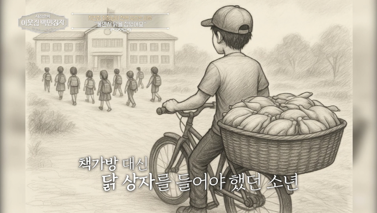 김재곤은 어린 시절 연탄가스 중독 사고로 한꺼번에 부모를 잃고, 불과 15살의 나이에 4남매의 가장이 되어 생계 전선에 뛰어들어야 했다. 동생들을 먹여 살리기 위해 육촌 형님이 운영하던 닭집에서 일을 시작한 그는 "배달 중 사고로 죽을 고비도 여러 번 넘겼다"고 담담히 고백한다.