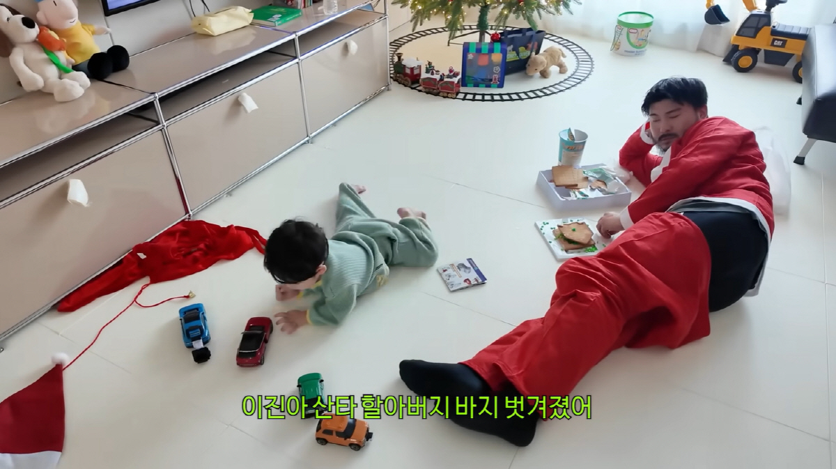 이날 산타 복장을 한 채 이진이와 놀아주던 카더가든은 "청소 안 할 거냐. 그럼 나도 안 할 거다"라며 바닥에 드러누웠다.