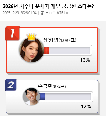 커뮤니티 포털사이트 디시인사이드(대표 김유식)가 '2026년 사주나 운세가 제일 궁금한 스타는?'으로 투표를 한 결과 장원영이 1위에 올랐다. 이 투표는 지난 12월 29일부터 1월 4일까지 총 7일간 진행했다.
