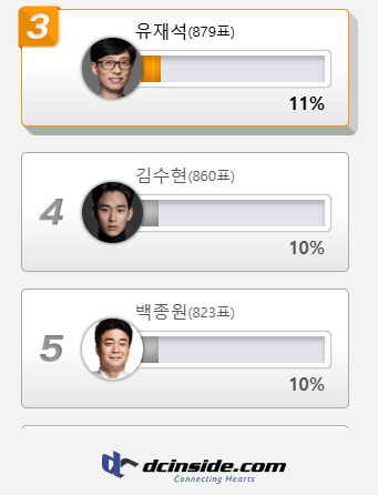3위는 879(11%)표로 유재석이 선정됐다. 국민MC로 불리며 많은 사랑을 받고 있는 유재석은 매년 여러 프로그램에서 운세를 공개해온 바 있다. 최근 MBC 방송연예대상에서 21번째 대상을 받으며 변함없는 전성기를 누리고 있는 유재석은 최근 2026년 신년에도 긍정적인 기운이 가득한 운세를 받아 눈길을 끌었다.