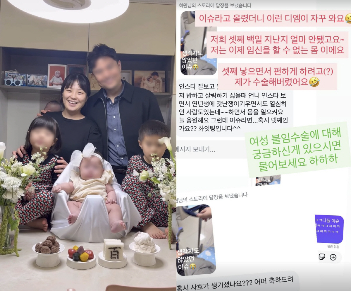 권미진이 팬에게 받은 DM은 넷째 임신 여부를 묻는 질문이었다. 권미진은 "여성 불임수술에 대해 궁금하신 게 있으시면 물어보세요 하하하"라며 유쾌하게 반응했다.