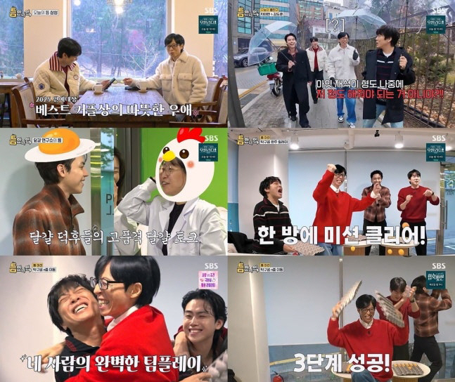 [스포츠조선 조민정 기자] SBS '틈만 나면,'이 유재석 유연석 차태현 김도훈의 완벽한 팀워크로 새해 첫 미션에 성공하며 화요일 밤 안방극장에 기분 좋은 에너지를 불어넣었다.