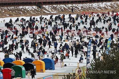 축제의 핵심인 송어 잡기는 얼음낚시, 텐트 낚시, 실내 낚시, 맨손 잡기로 다양하게 구성됐다.