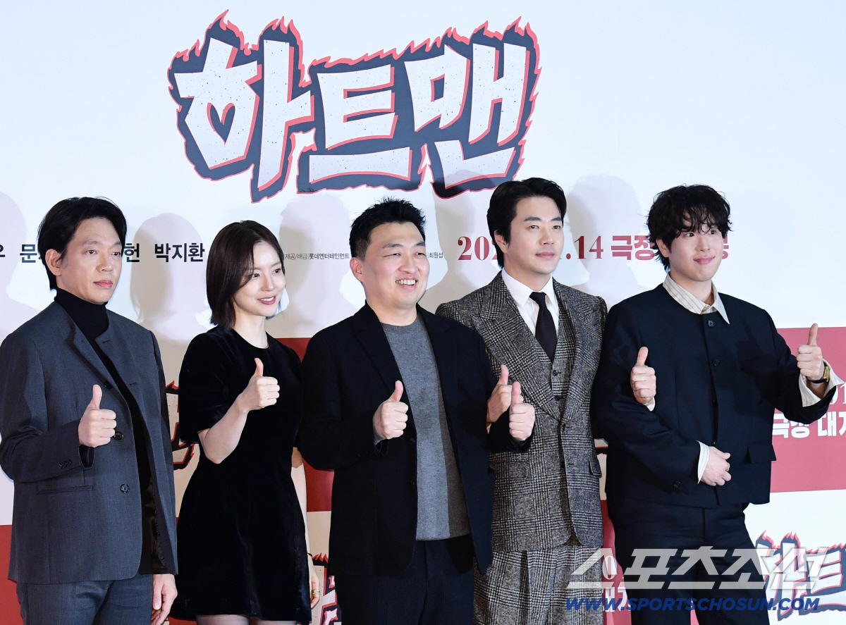 8일 잠실 롯데월드타워 롯데시네마에서 영화 '하트맨' 언론시사회가 열렸다. 포토타임 포즈를 취하고 있는 최원섭 감독과 주연 배우들. 잠실=송정헌 기자songs@sportschosun.com/2026.01.08/