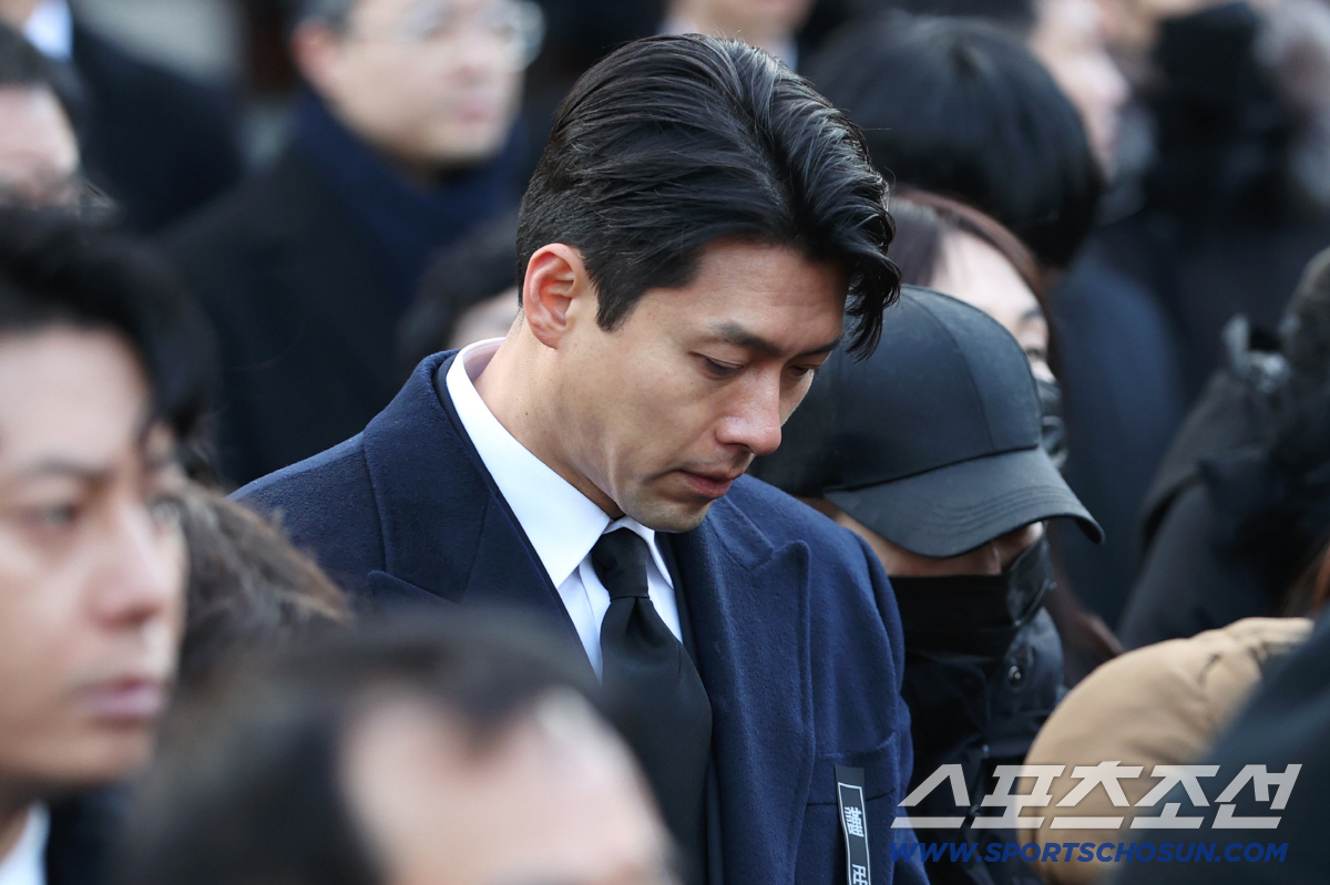 9일 오전 '국민배우' 고(故)안성기의 영결식이 서울 중구 명동성당에서 엄수됐다. 동료 후배 영화인들이 자리에 함께해 고인과 마지막 인사를 했다. 영정은 정우성, 훈장은 이정재가 들고 설경구, 박철민, 유지태, 박해일, 조우진, 주지훈이 고인의 운구를 들었다. 발인 참석한 현빈. 명동성당=송정헌 기자songs@sportschosun.com/2026.01.09/