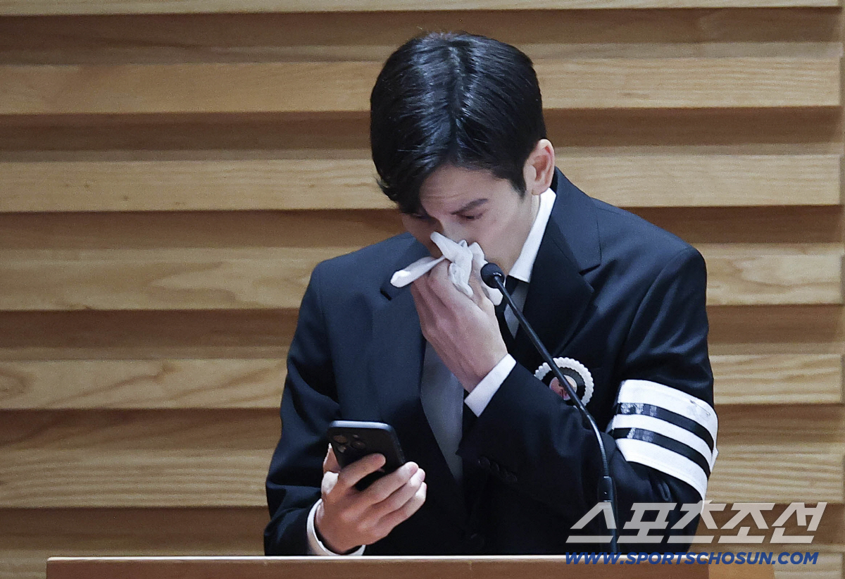 [스포츠조선 안소윤 기자] 배우 고(故) 안성기의 장남 안다빈 씨가 어린 시절 아버지에게 받은 편지를 낭독하며 눈물을 보였다.