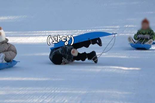 하지만 두 번째 시도에서 예상치 못한 사고가 발생했다. 옆에서 내려오던 썰매와 부딪히면서 준범 군의 썰매가 뒤집혔고, 그는 그대로 눈 위로 넘어지고 말았다.