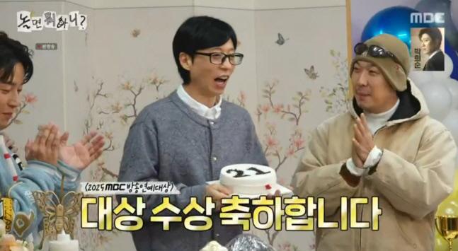 이날 멤버들은 '2025 MBC 방송연예대상'에서 통산 21번째 대상을 수상한 유재석을 향해 축하를 전했다. 유재석은 "우리가 함께 받은 대상이다. 너무 고생을 많이 하셨다"며 멤버들과 제작진에게 공을 돌리며 겸손한 소감을 전했다.