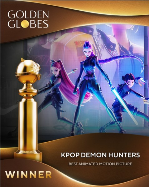'케데헌'은 11일(현지시간) 미국 로스앤젤레스 베벌리힐튼호텔에서 열린 제83회 골든글로브 시상식에서 애니메이션상과 주제가상(골든·Golden) 수상작으로 호명됐다.