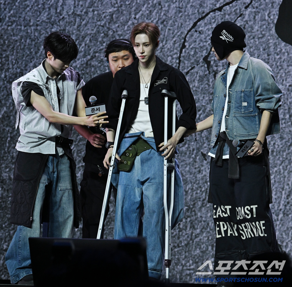알파드라이브원 아르노, 데뷔 쇼케이스서 목발 투혼…"경미한 부상"