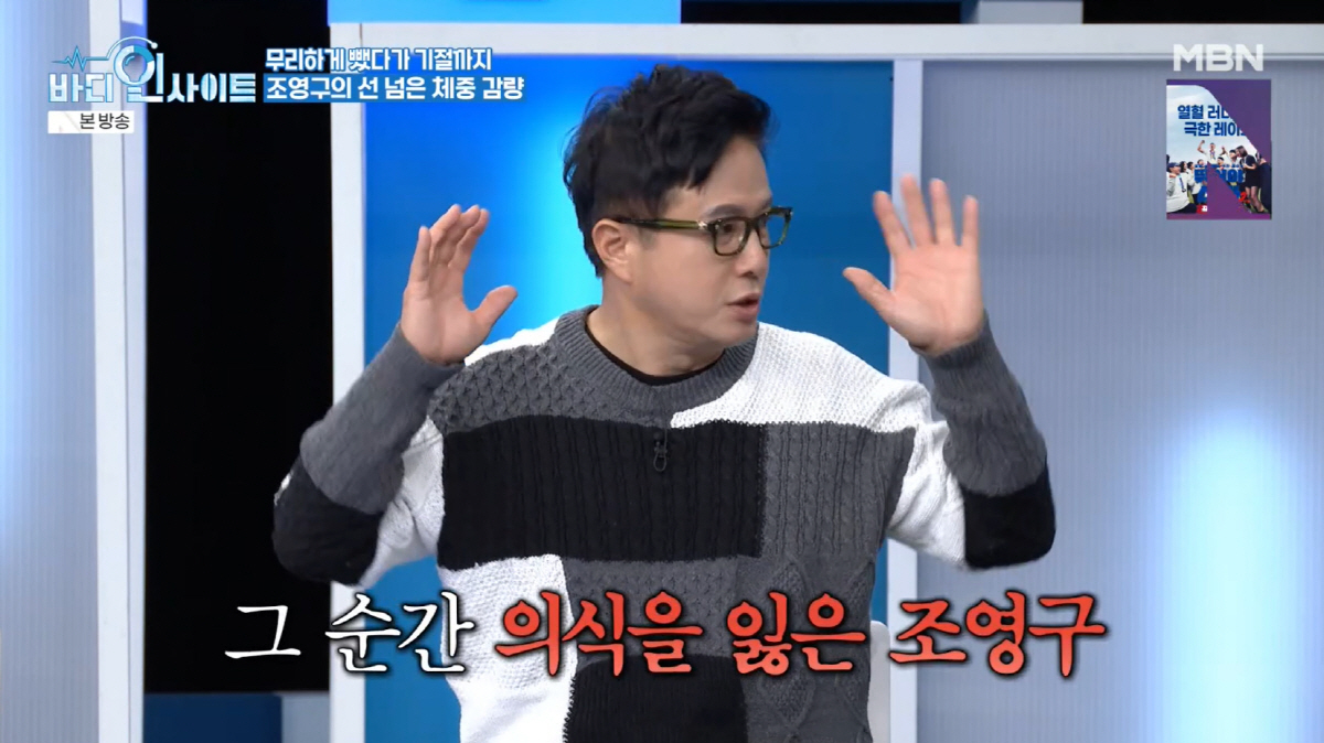 조영구는 "항상 소화가 안 됐다. 또 감량한 몸을 지켜야 한다는 압박에 매일 고강도 운동을 반복했다"며 "어느 날 윗몸일으키기를 하고 났더니 어지러워서 잠시 누워 있었다. 매니저가 나를 부르는데 그 순간 의식을 잃었다"고 밝혀 충격을 안겼다.