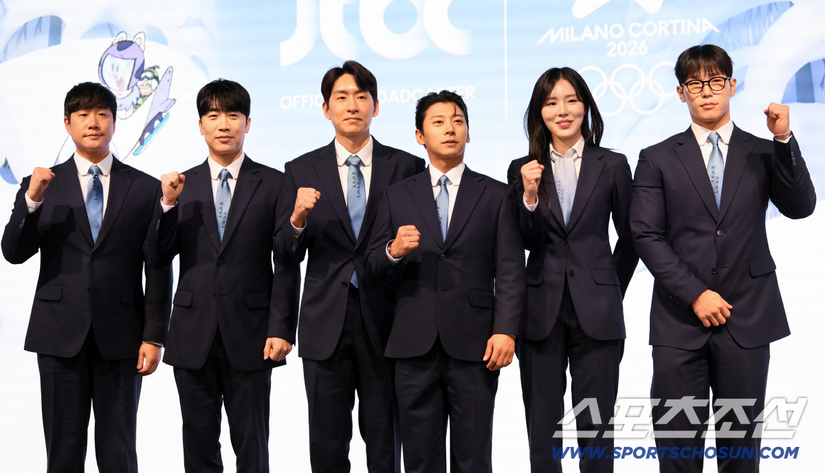JTBC 2026 밀라노 코르티나 동계올림픽 기자간담회가 14일 서울 여의도 페어몬트 앰배서더에서 열렸다. 배성재, 성승헌 캐스터, 이승훈, 곽윤기, 김아랑, 윤성빈 해설위원이 포토타임을 갖고 있다. 여의도=박재만 기자 pjm@sportschosun.com