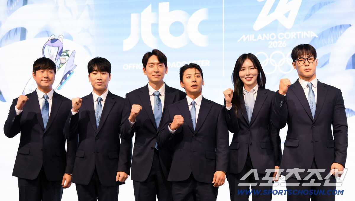 JTBC 2026 밀라노 코르티나 동계올림픽 기자간담회가 14일 서울 여의도 페어몬트 앰배서더에서 열렸다. 배성재, 성승헌 캐스터, 이승훈, 곽윤기, 김아랑, 윤성빈 해설위원이 포토타임을 갖고 있다. 여의도=박재만 기자 pjm@sportschosun.com