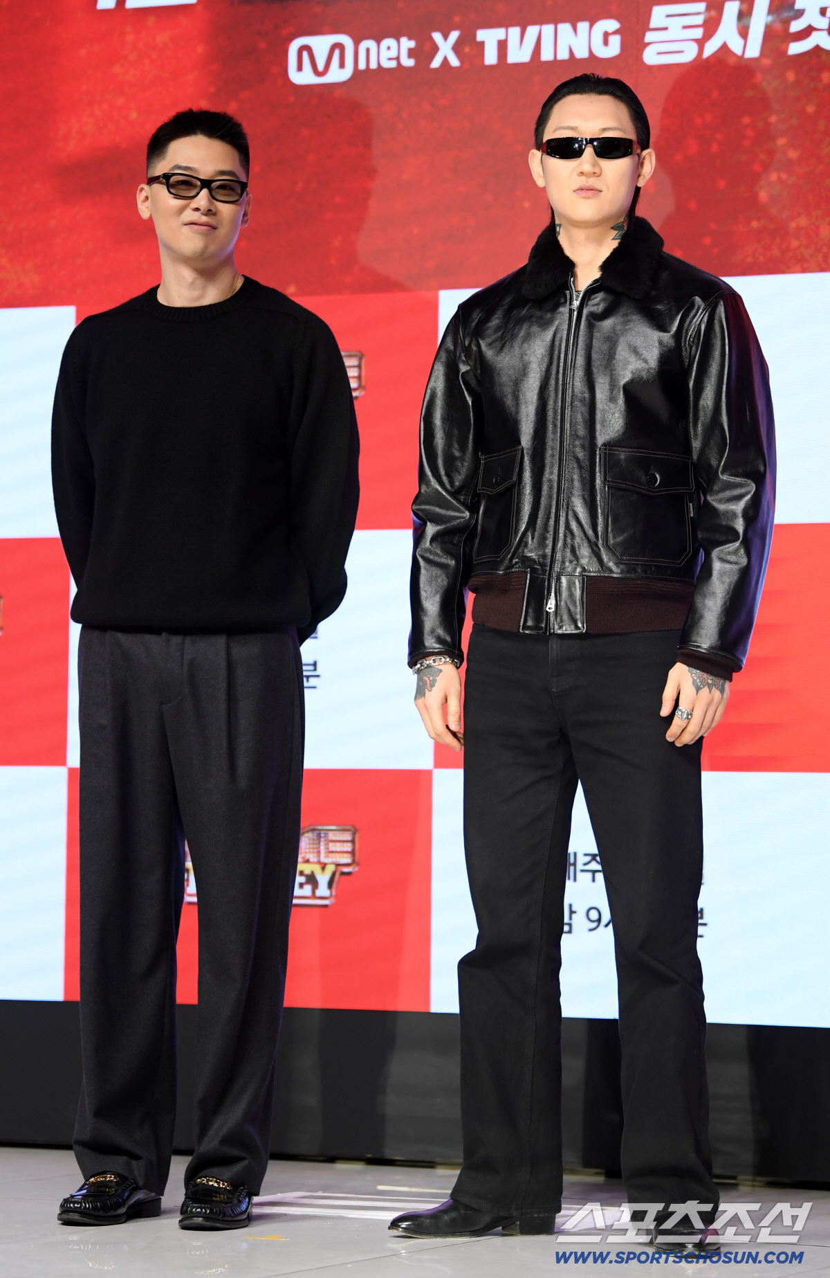 Mnet '쇼미더머니12' 제작발표회가 15일 서울 강남구 논현동 엘리에나 호텔에서 열렸다. 허키 시바세키, 제이통이 포토타임을 갖고 있다. 논현동=박재만 기자 pjm@sportschosun.com/2026.01.15/