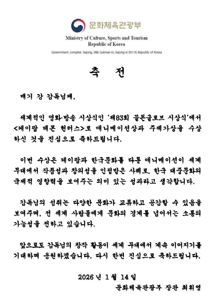 [스포츠조선 전영지 기자최휘영 문화체육관광부 장관이 '제83회 골든글로브 시상식'에서 애니메이션상과 주제가상을 수상한 '케이팝 데몬 헌터스' 매기 강 감독에게 축전을 보냈다.